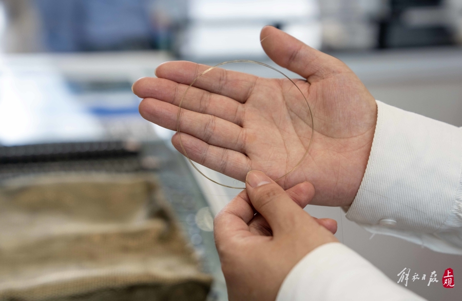 据东华大学教授、博士生导师、先进纤维材料全国重点实验室成员汪庆卫(左一)介绍,东华大学因其科研优势,朱美芳院士、成艳华、汪庆卫团队有幸获得嫦娥五号真实月壤500毫克,研究团队根据真实月壤的组分和特性,自制模拟月壤,通过1400℃至1500℃高温熔融与真空牵引技术,成功制备出直径仅10微米至20微米(头发丝的1/5到1/6)的超细纤维。为了能在月球“服役”,研究团队自主研发了一台可用于深空环境的“原位制备月壤纤维模块化装备”,从而克服月球上无人、真空、低重力的环境。